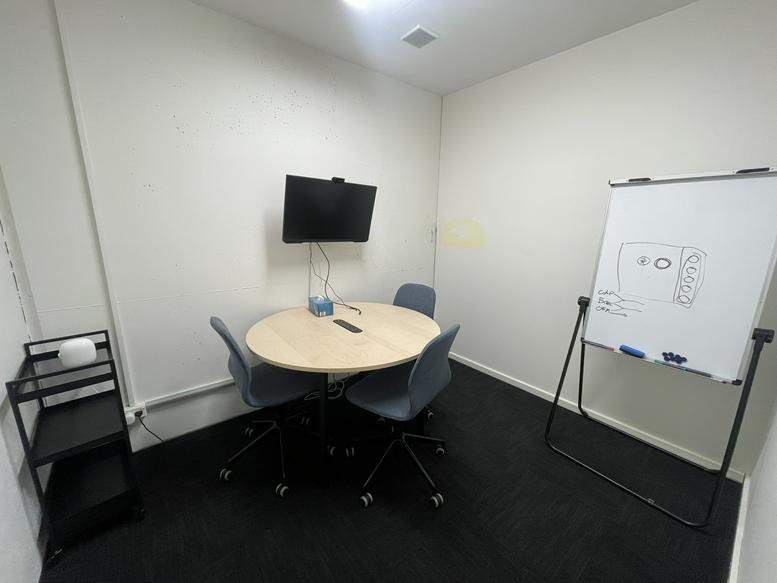 This accommodation features a private, enclosed room suitable for a dedicated office or secure storage, a well-appointed conference room for eight, and a smaller meeting space for three. A separate shelved storage area is also provided.